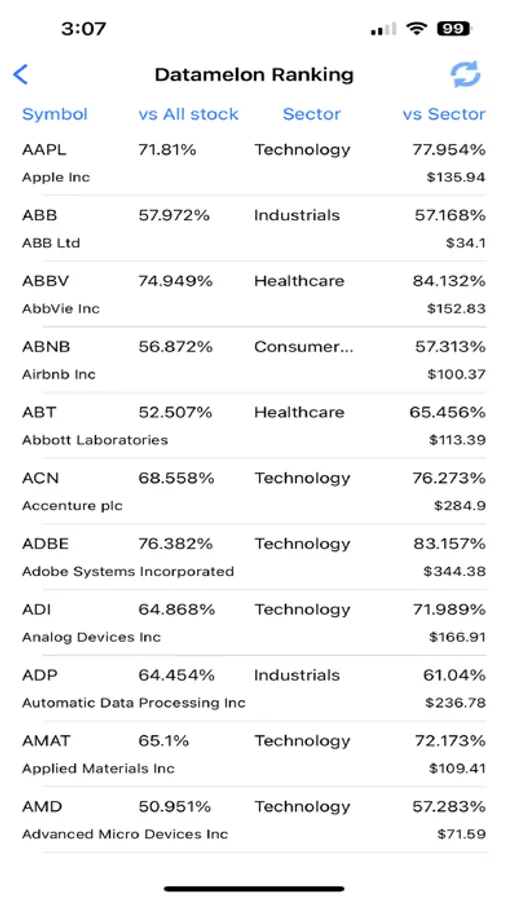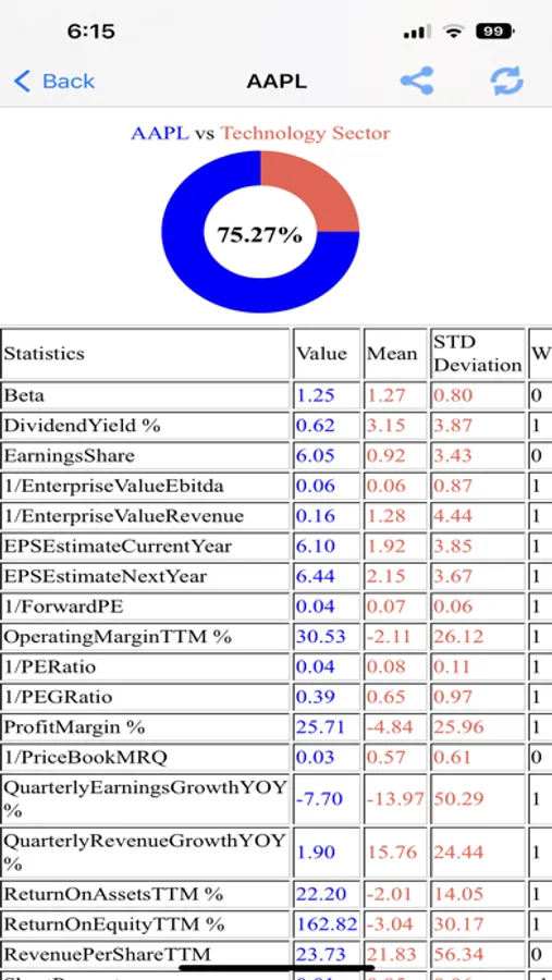 - Stock evaluation feature that calculates a percentile ranking of a stock through comparing it with all stocks and its sector across 20 selected key statistics. Users can adjust the weight of each key statistic to achieve the desired result.