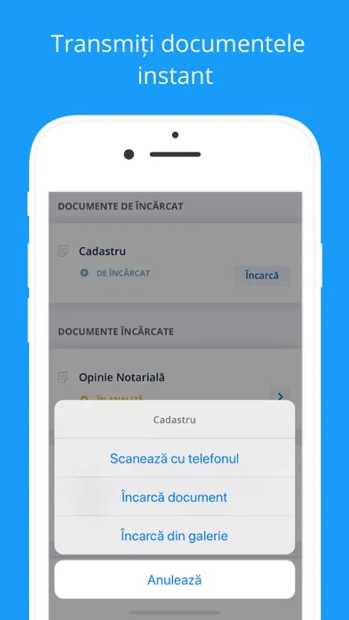 • Încărcare documente - de pe telefonul mobil (fotografii din galerie sau realizate cu telefonul / spațiul de stocare local sau virtual). Încărcarea este disponibilă ca încărcarea individuală a fiecărui fișier în slotul său și / sau ca un singur fișier care conține toate documentele.