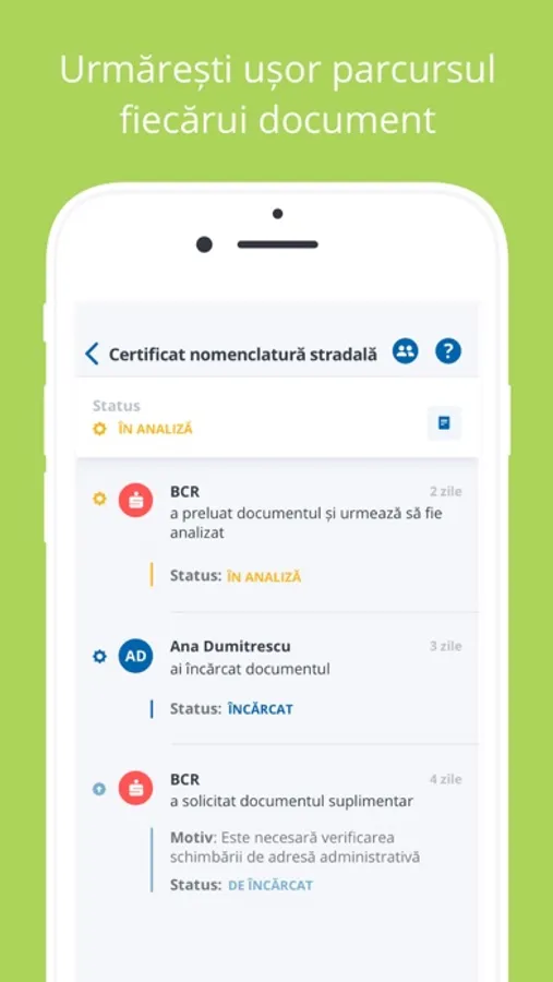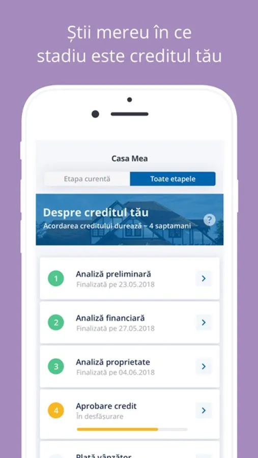 • Notificări push (corecție pentru documentele încărcate, rezoluție etapă și atenționare privind expirarea ofertei sau a aprobării financiare.