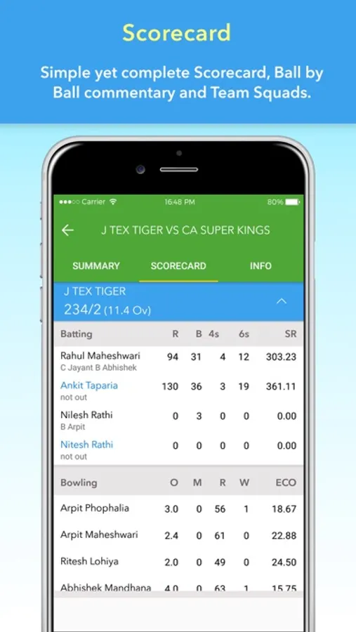 CricSync gives individual stats for all the players and detailed match scorecard.