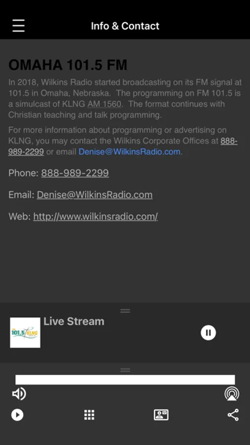 Local Christian teaching and preaching programming for Omaha, Nebraska. In 2018, Wilkins Radio started broadcasting on its FM signal at 101.5 in Omaha, Nebraska. The programming on FM 101.5 is a simulcast of KLNG AM 1560. The format continues with Christian teaching and talk programming.
