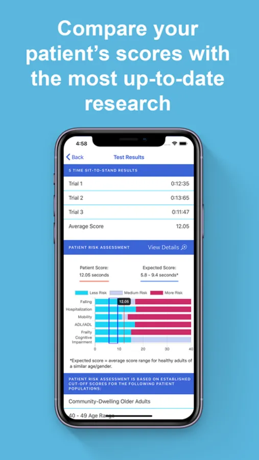 Simply select your patient’s demographic and Mobile Measures will create an individualized patient report, comparing their performance to relevant cut-off scores and normative data. Now you can visualize the impact of your patient’s condition, track progress, and determine the effectiveness of treatments directly at the point of care!