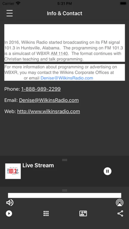 Local Christian teaching and preaching programming for Huntsville, Alabama. In 2016, Wilkins Radio started broadcasting on its FM signal 101.3 in Huntsville, Alabama. The programming on FM 101.3 is a simulcast of WBXR AM 1140. The format continues with Christian teaching and talk programming.