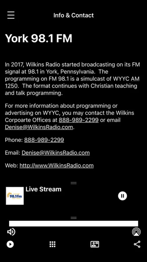 For more information about programming or advertising on WYYC, you may contact the Wilkins Corporate Offices at 888-989-2299.