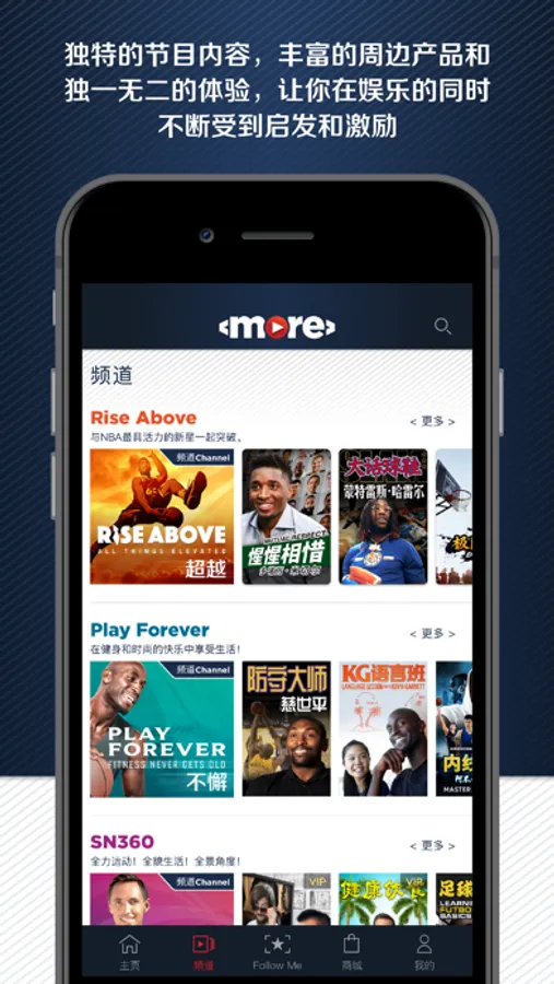 MORE上的各个频道均为篮球迷和体育迷们打造,将提供独一无二的节目、产品和特殊功能。