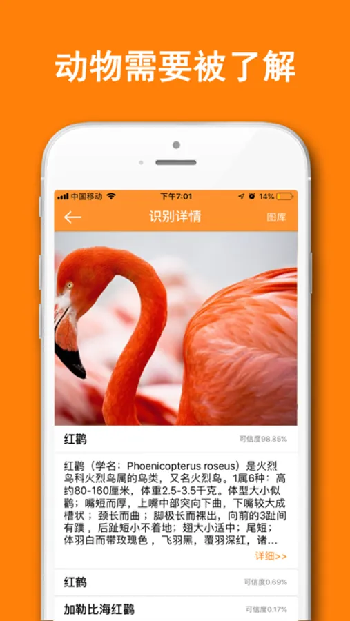 动物识别器,手机秒变动物鉴别专家。基于人工智能深度学习和大规模图像训练,准确识别图片中的动物。