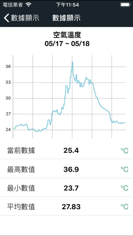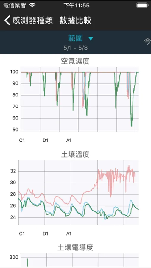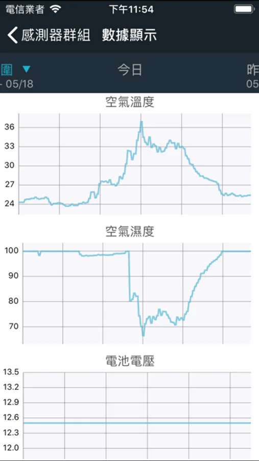 讀取資料庫數據,感測器根據Sensor gateway, 場域分類,並提供日期範圍選擇,將特定範圍數據繪製成圖表顯示於螢幕