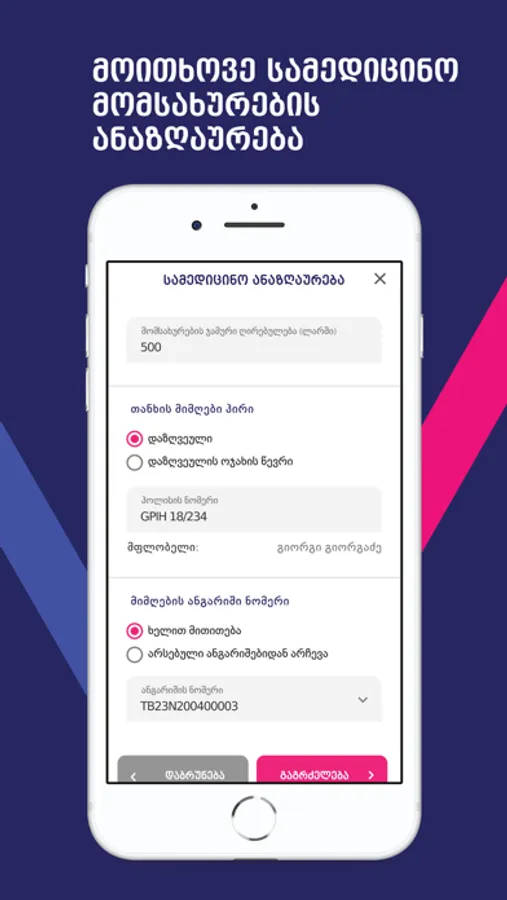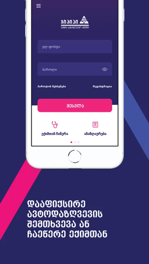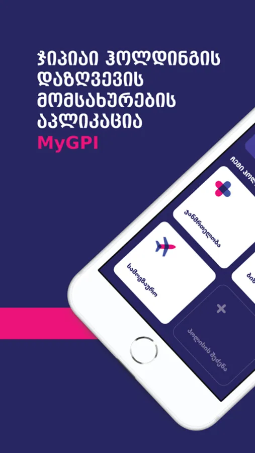 Download the app, register or authorize with your user and password, enter your personal account and get started. In order to receive user and password for your personal account, you have to register on the web page mygpi.ge or in in mobile application.