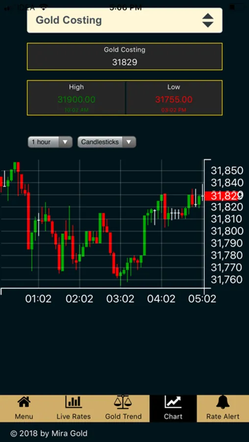 Mira Gold iOS App has unique feature of Live Gold Price Charts, the Gold Price Charts includes 15min, 30min, 1Hour, and 1 Day Chart to show precise daily price movement of Gold. It also has facility of Candle Stick Chart, Line Chart and OHLC Chart.