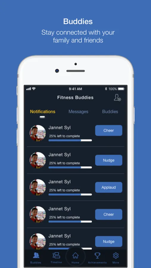 Fitness Buddy: A social hub where you can see activities of your friends & family. You can motivate, cheer or applaud each other and achieve goals together.