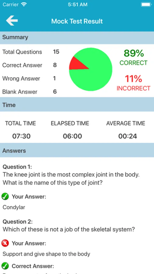 - Shows your quiz history with your answer and correct answer anytime.