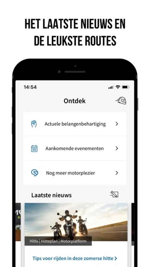 De KNMV app inspireert je met het laatste motornieuws, de aankomende evenementen en belangrijke zaken rondom de belangenbehartiging van motorrijders. Dit is ook toegankelijk voor niet-leden! Als KNMV-lid biedt de app dezelfde handige functies en voordelen als vroeger je plastic ledenpas. Zo vind je er ook kortingspassen met leuke aanbiedingen en kun je notificaties ontvangen wanneer er bijvoorbeeld een wedstrijd wordt afgelast.