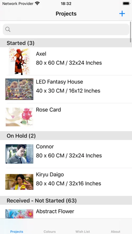 Organise your projects into different status: Completed, Started, Not Started, Not Received, Wish List, On Hold, Gifted, Kitted Up, Sold - Not Completed, Lost