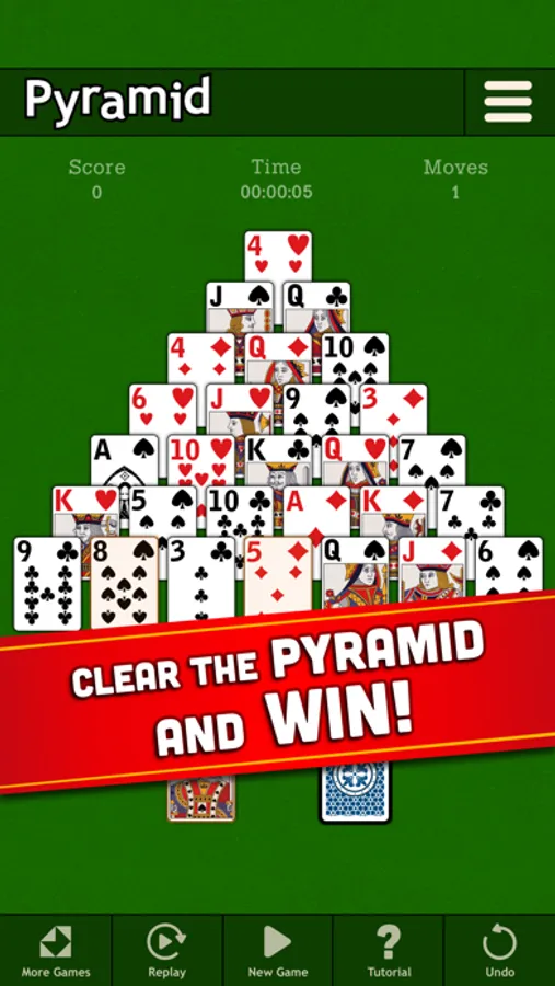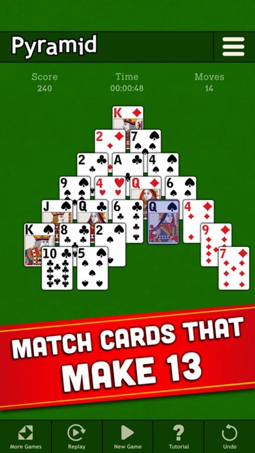 Add Pyramid to your collection of classic card games and you’ll have a great puzzle that is easy to play and re-play. For an additional challenge, try to beat the score of the other players in the leaderboard or replay a match to better your time or solve it in less moves.