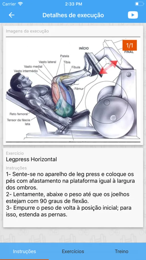 - Treinar com o nosso "Treinador Virtual" que te mostra como fazer cada exercício da ficha, cronometrando seu tempo de descanso e te mostrando a forma de execução através de imagens e vídeos.