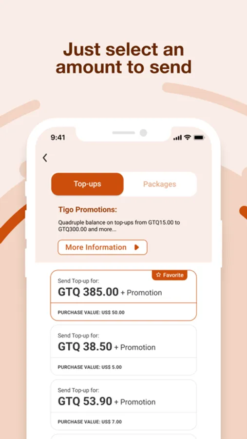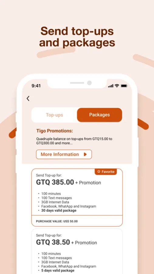 We offer: air time packages and internet packages so you can send the mobile top up that fits your budget and needs of your family or friends.