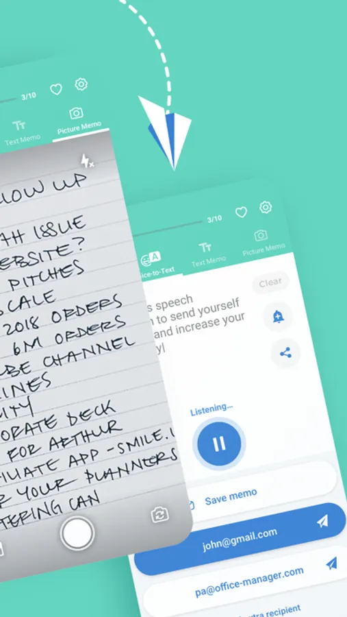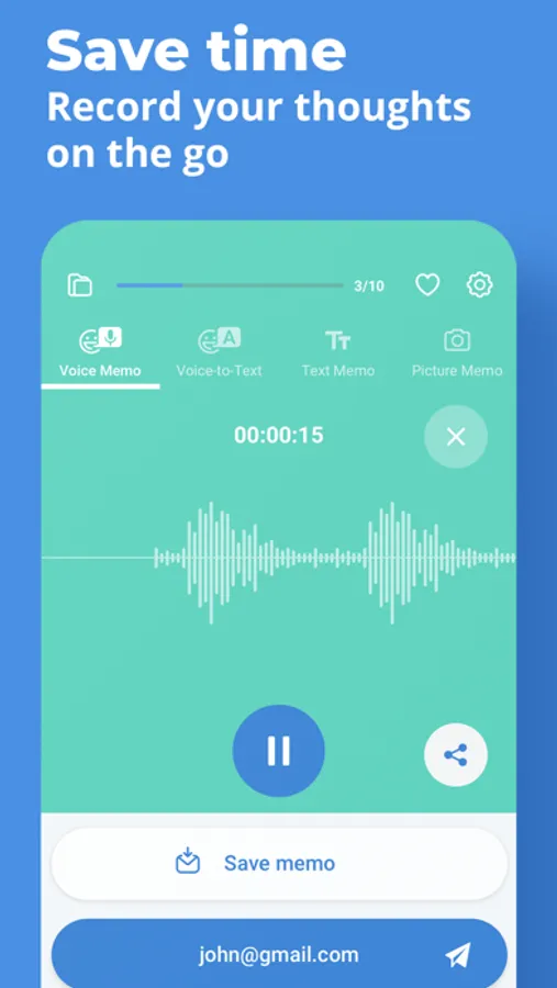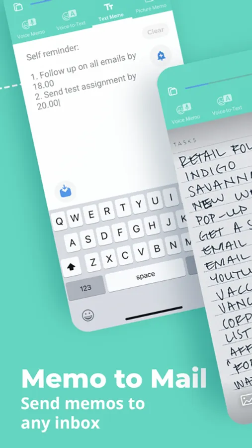 VoNo enables you to mail yourself (and others) with just one single tap. Use VoNo to quickly mail SpeechNotes, Voice Memos, Text Notes or Picture Notes. Perfect for distributing tasks via email to your colleagues.