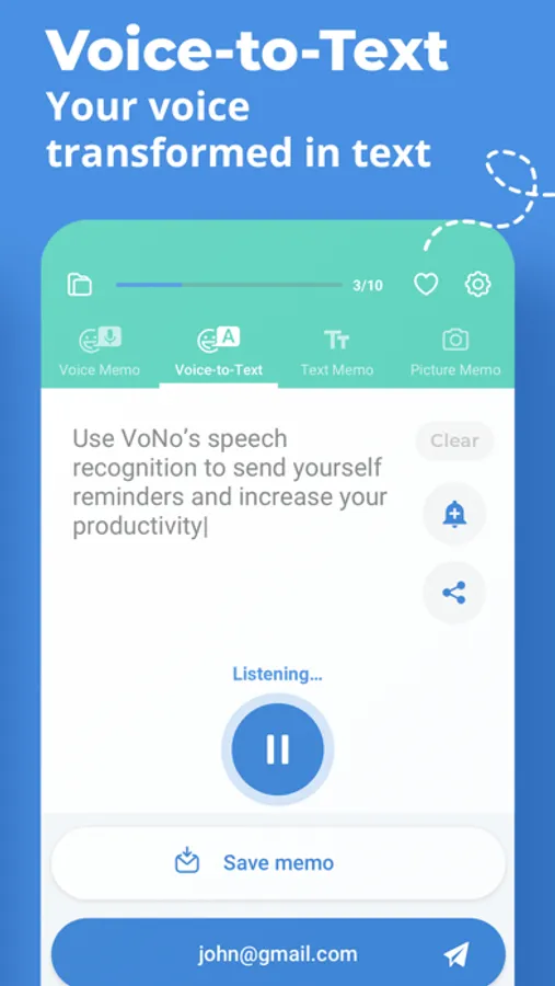 Just press and record your Speech Notes, Voice Memos, Picture Memos, Text Notes and Reminders in a single tap. VoNo is a One click thought capture app including a reliable Voice-to-Text feature using speech recognition.