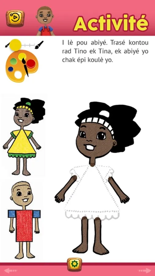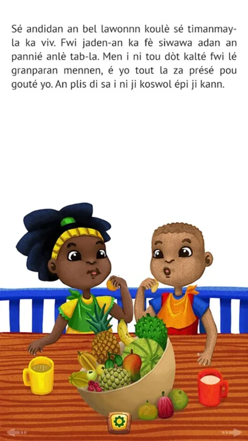 Une réplique numérisée d'un livret qui permet en effet à l'enfant de suivre la lecture effectuée par l'adulte. Il tourne les pages virtuelles au rythme de la lecture. Il sélectionne, en cliquant, ses réponses lors des activités successives. Il peut enfin choisir, avec l'adulte, une lecture en français ou en créole en sélectionnant dès le début la langue souhaitée. Cette lecture donne lieu à des ateliers de langage animés par l'adulte, dans les situations de lecture collective. Un usage autonome de l'application par l'enfant est également possible avec une tablette, l'application proposant une interactivité autour de l'écoute, de la compréhension et de la restitution des textes lus par la narratrice mais aussi des consignes relatives aux activités proposées.