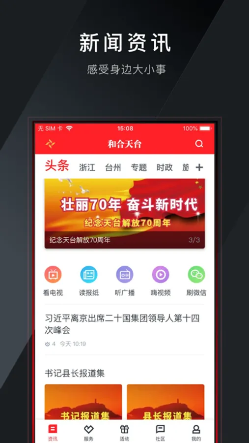 和合天台APP为粉丝提供最丰富、最精彩的新闻资讯,让您人不出门尽晓身边事,同时还提供最方便、最快捷的生活服务和“助跑”服务功能,让您尽享移动网络时代新生活。