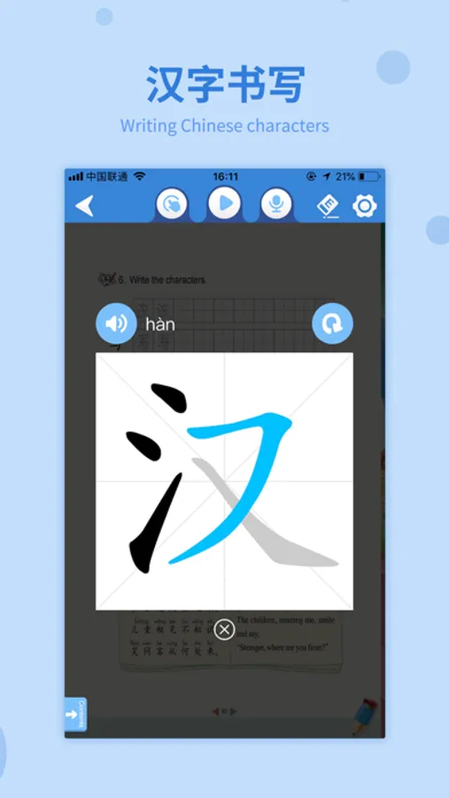 4、Aiming at the difficulty of Chinese strokes, the three steps of watching the strokes demonstration,describing the strokes and memorial writing guide the writing process step by step.