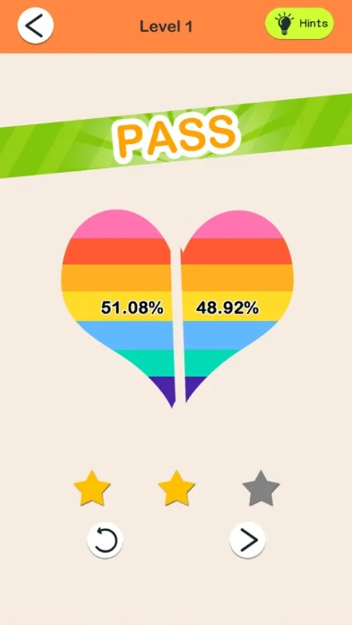 In each level, there is a regular shape, you just need to cut it into equal two or four slices. The more close the area of the slice is, the more stars you can get!