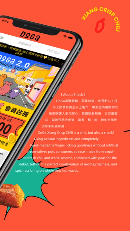 想要品嘗獨家研發「香酥脆椒(辣椒餅乾)」、「辣味休閒零食系列」,快下載DoGa香酥脆椒超人氣專屬APP,使用手機便可隨時瀏覽品牌專館,清楚的品牌故事和產品介紹可以快速找到您想要的商品,快速結帳與配送,讓您購物輕鬆、吃得開心。