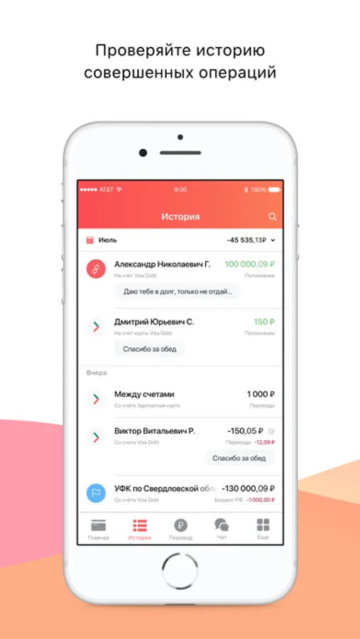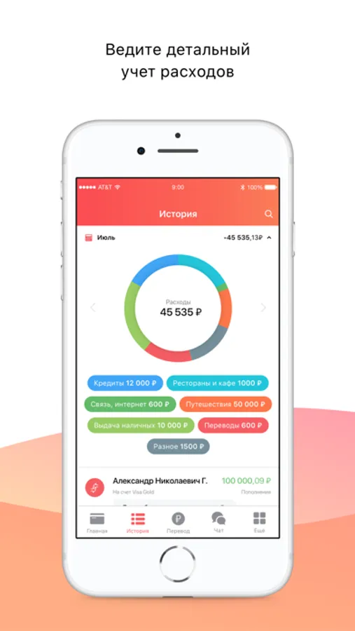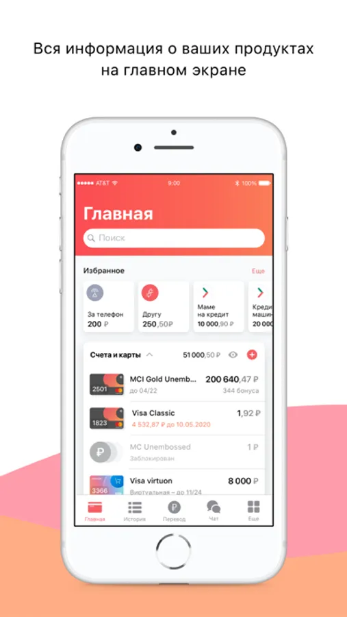 ∙ отображение баланса по счетам, картам, вкладам и кредитам;