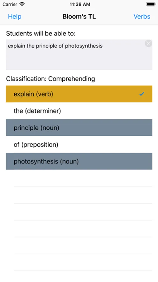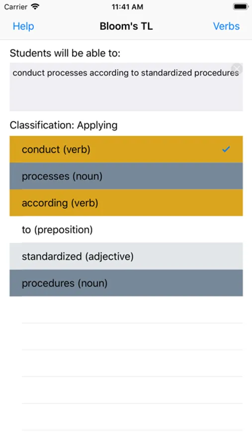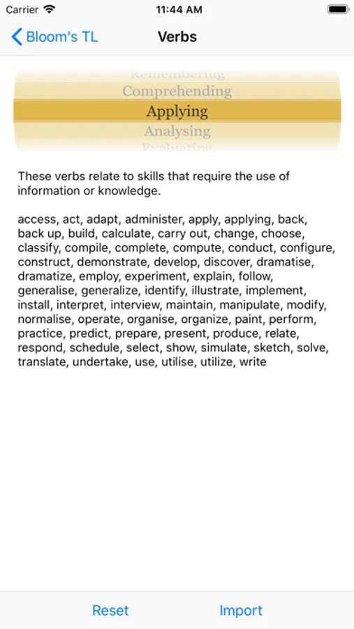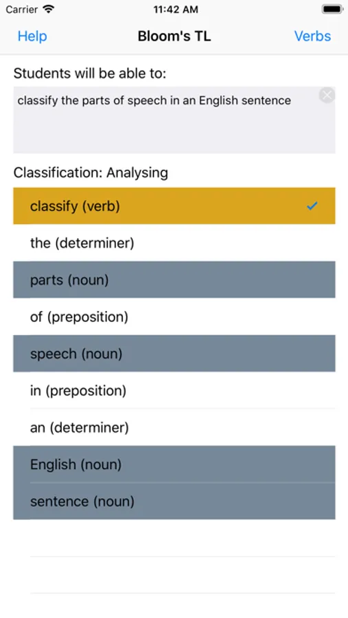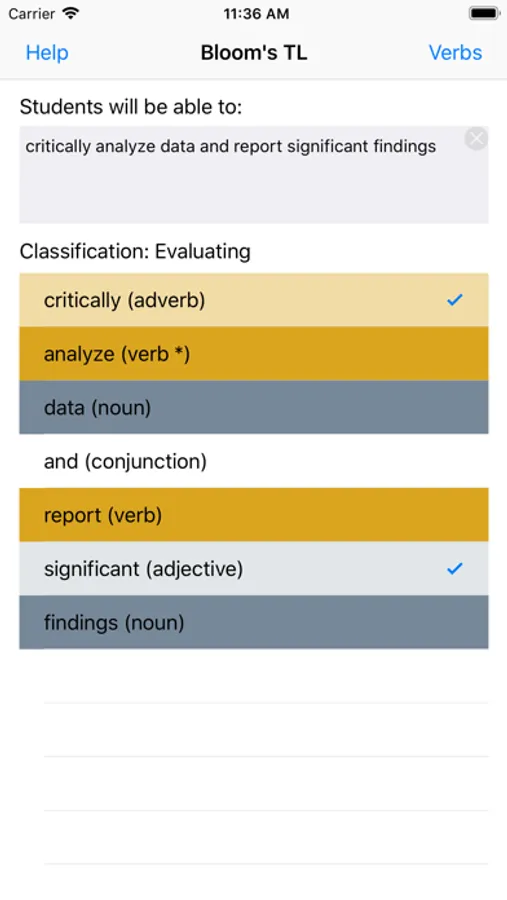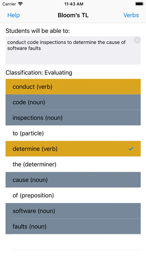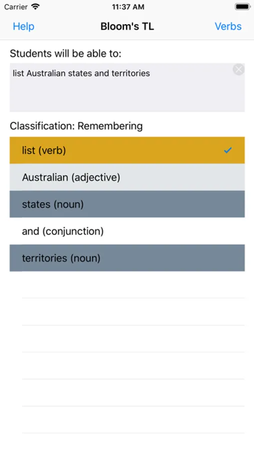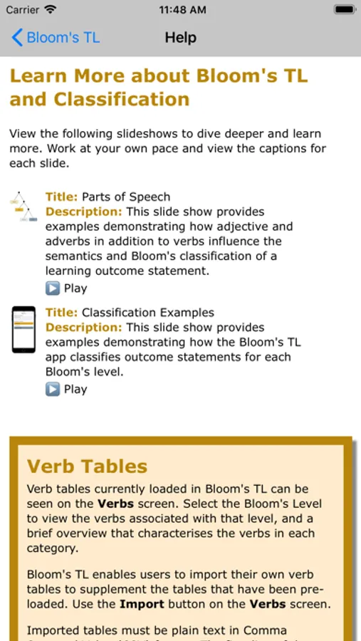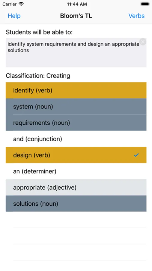 Blooms TL classifies learning outcome statements based on Bloom's Taxonomy (Anderson and Krathwhol, 2001). This taxonomy describes the depth of thinking required by students in learning activities and assessments. The six levels in Bloom's taxonomy are: remembering, comprehending, applying, analysing, evaluating, and creating. The classification in this app uses tables containing parts of speech that are generally classified at a given Bloom's level. These tables have been previously been identified in the education literature (Stanny, 2016; von Konsky et al. 2018).