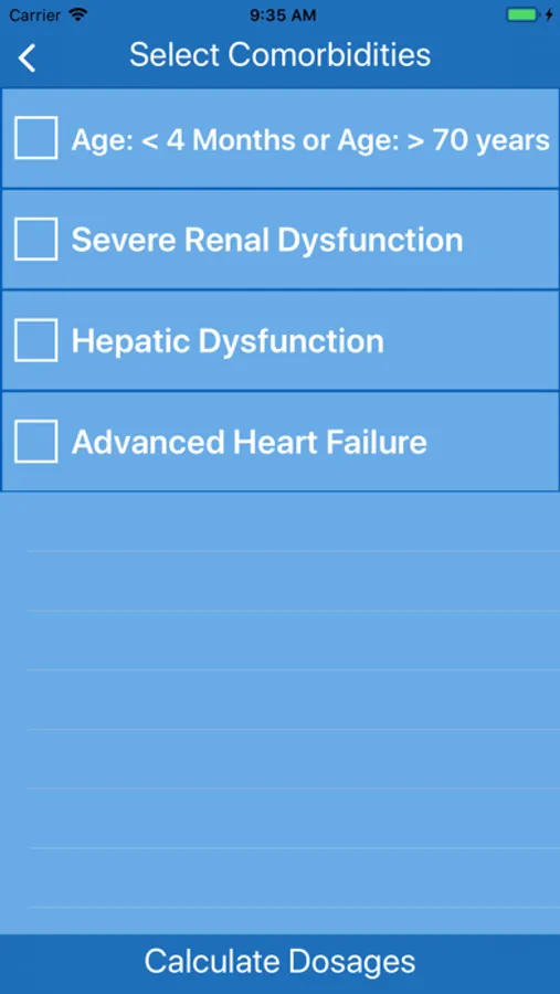 ● Option to add comorbidities such as extremes of age, severe renal dysfunction, hepatic dysfunction, or advanced heart failure, with automatic adjustment of maximum safe dose.