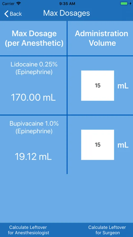 ● Dosage calculator for local anesthetics, including complex mixtures and non-standard concentrations.