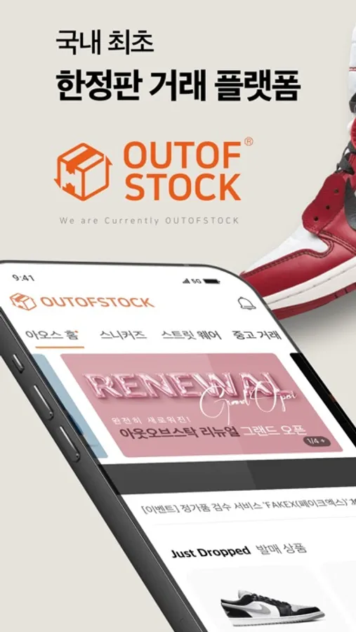 아웃오브스탁(OUTOFSTOCK)은 새로운 거래의 기준을 제시하는 중개 플랫폼으로 빠르게 품절되는 한정판 제품을 포함하여 스니커즈, 스트릿 웨어 등 다양한 종류의 제품을 가장 빠르고 편리하게 그리고 무엇보다 안전하게 거래할 수 있습니다.