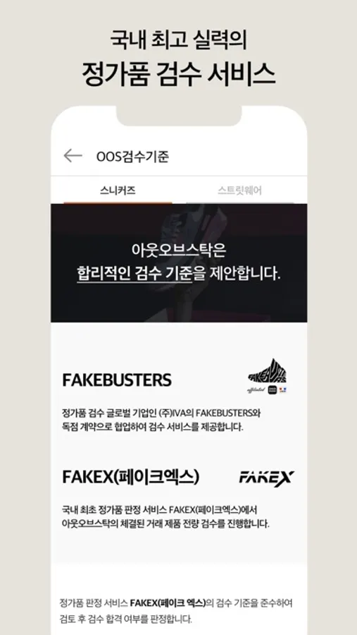 특히, 아웃오브스탁은 정가품 검수 글로벌 기업인 IVA Corp(Fakebusters)와 협력하여 오차없는 복합 검수 서비스를 제공하며 거래되는 모든 제품의 전량 검수를 국내 최초 한정판 정가품 판정 서비스인 FAKEX(페이크 엑스)에서 진행하고 있습니다.