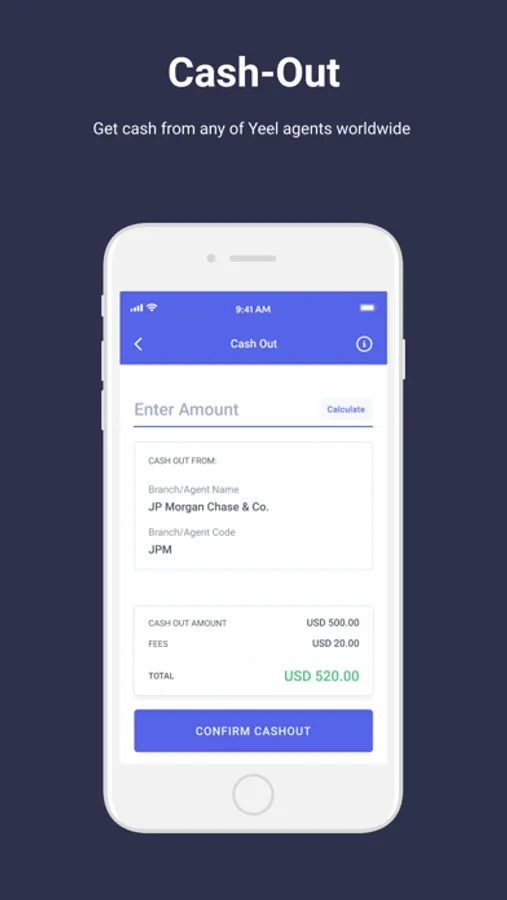 • Get access to your funds anywhere by using the cash-out feature at an authorized Yeel Agent worldwide.