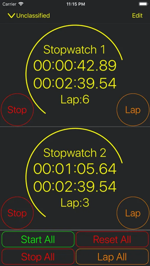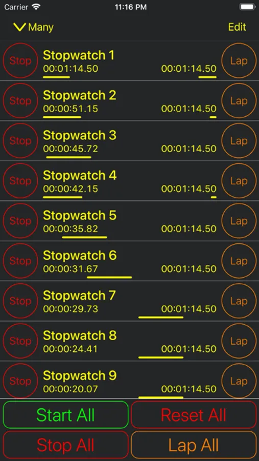 You can generate a group of stopwatches and operate them simultaneously.