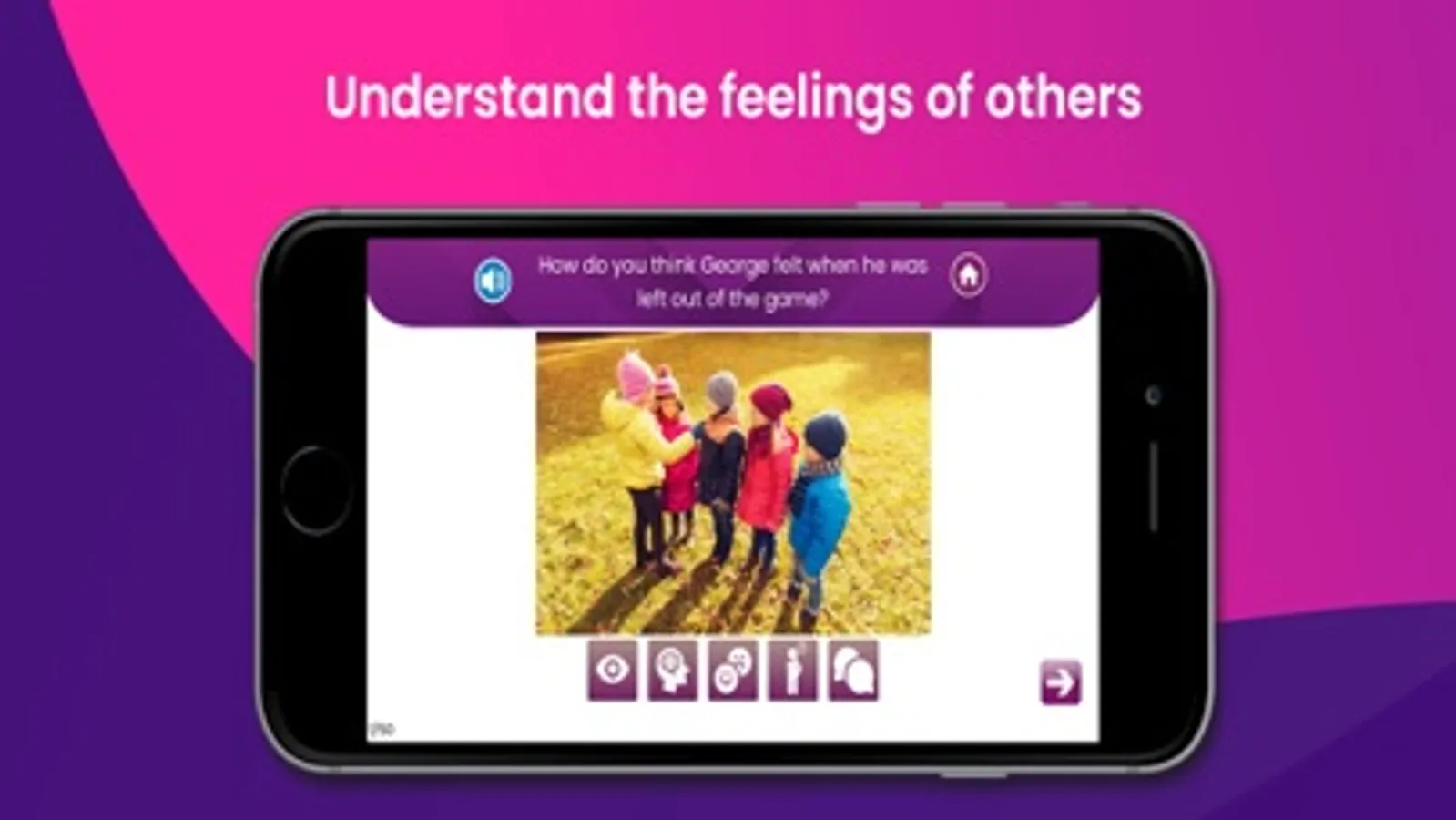 Look at the picture, then touch the 5 buttons to see each question. The questions are adapted for each picture scene but they follow the same pattern. Hear the question spoken aloud by the app, read it aloud for the user or ask them to read it aloud.