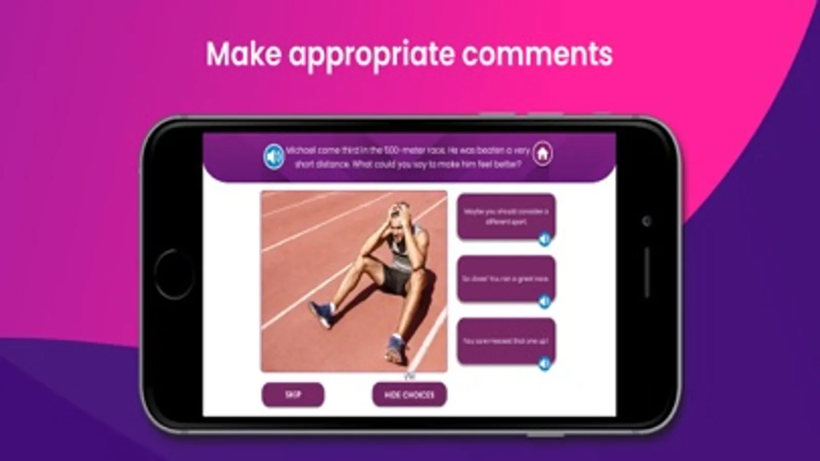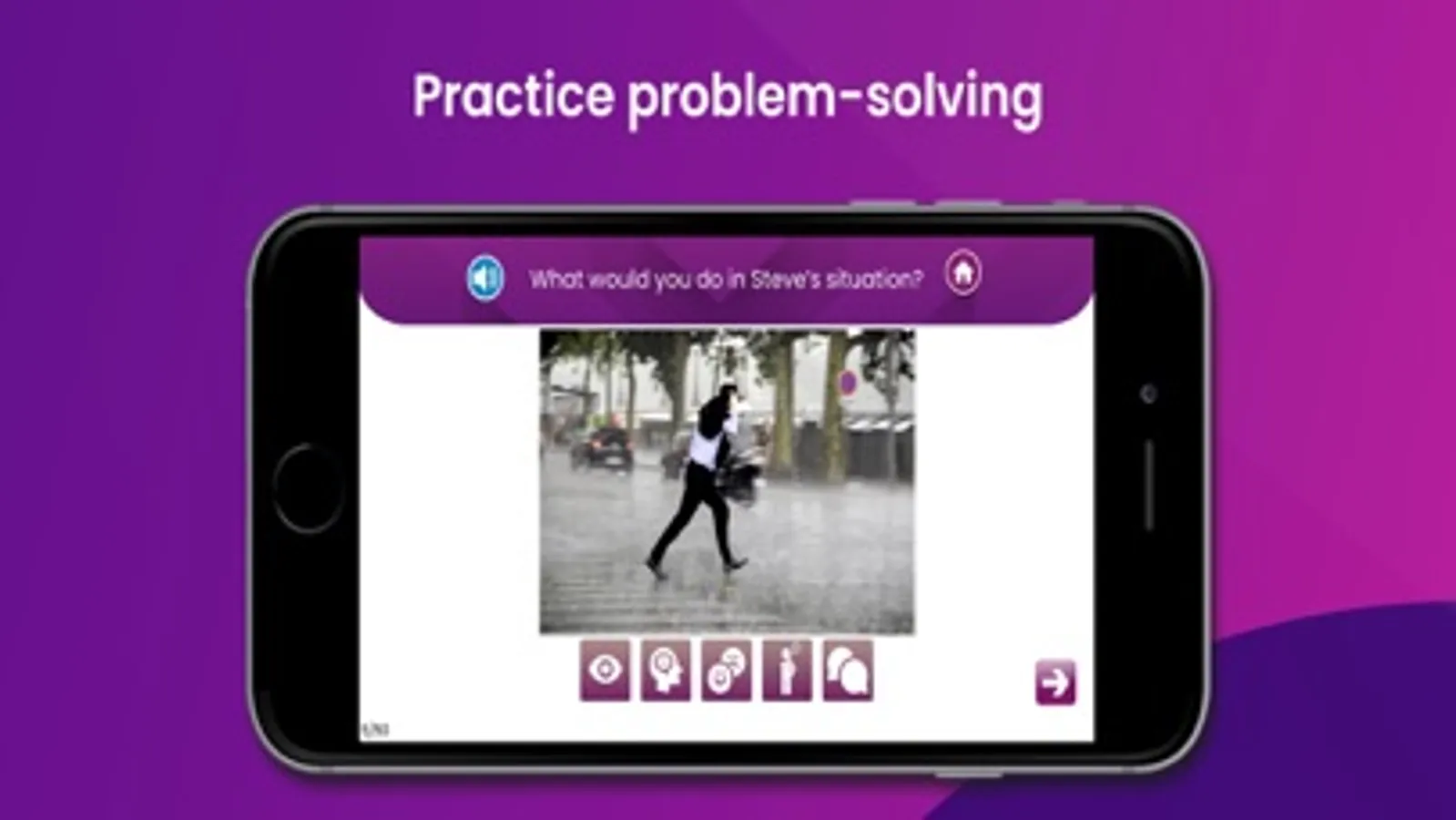 Look at the picture. Hear the scenario spoken aloud by the app, read it aloud for the user or ask them to read it aloud.