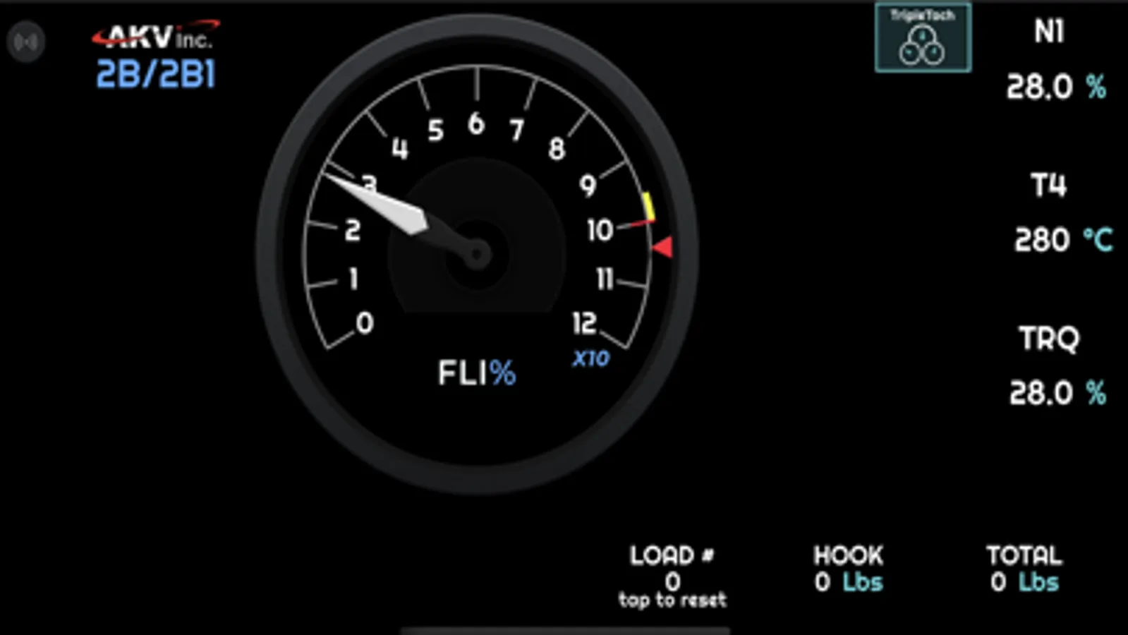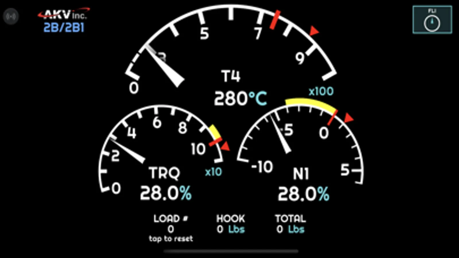 This Patented system is for use in helicopter external-load operations. It is designed for use with either the iPad mini 4 and iPhone 8 or newer IOS systems. The App receives the engine data from either our ETM1000 or DCS1100 Data Collection Systems via Bluetooth. The iPad or iPhone is mounted next to the external load window and provides a higher level of safety by locating the power instruments in the same sight line as the external load. The App displays the hook weight, a total weight carried in Kg or Lb and a load counter when used with the DCS1100. The load counter and total weight are resettable from within the App.