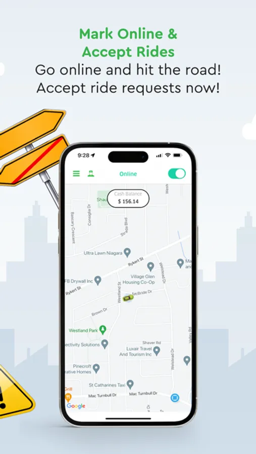 • Home: The “Home” screen will show an “online” button, which will automatically switch on once you open the app. You will also find the “cash balance” and menu buttons.