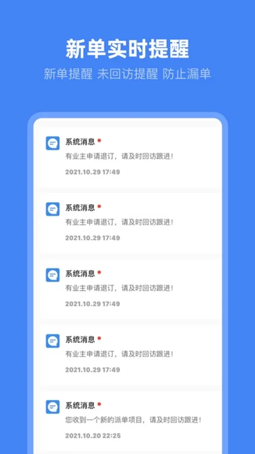 新的派单一段时间后没有回访,系统会贴心提醒,防止您忘记跟进。