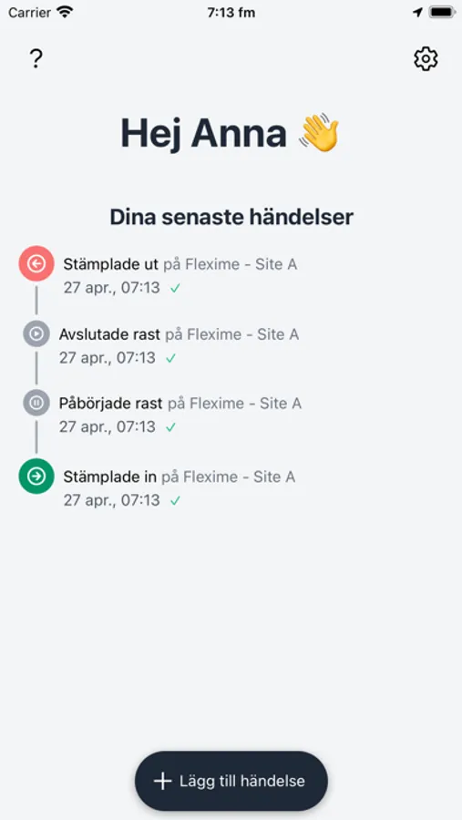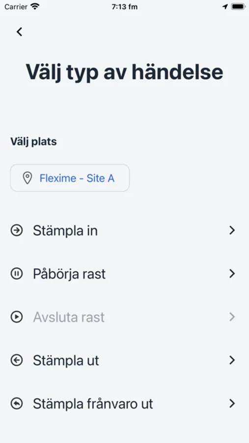 Flexime appen låter dig stämpla in och ut på inom området för din arbetsplats. Om du inte har internetåtkomst, så kommer appen att skicka dina stämplingar vid ett senare tillfälle, när internetåtkomst finns.