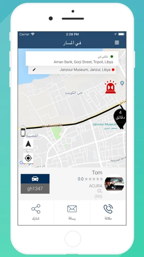 - سترى صورة السائق ونوع السيارة، ويمكن تتبعه على الخريطة.