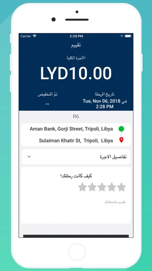 عند انتهاء الركوب، يمكنك تقييم السائق وكتابة تعليق لتمكننا من تحسين خدمة العملاء. أيضا سوف تتلقى بريد إلكتروني بإيصال الاستلام.