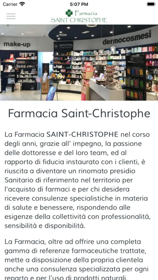 L'App della Farmacia Saint Christophe di Aosta ti permette di avere i tuoi farmacisti di fiducia sempre a portata di mano con consigli, informazioni, prenotazioni, ordini, richieste di prodotti e servizi in farmacia.