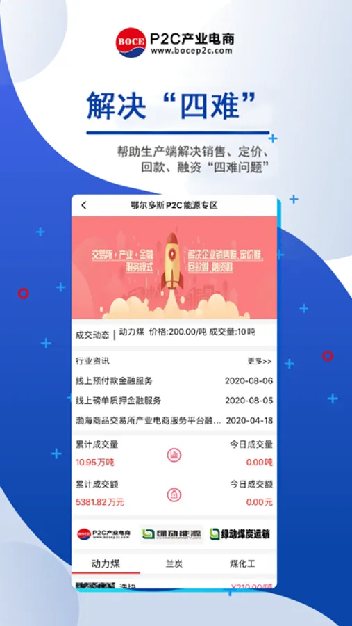 "P2C产业电商"是天津渤海商品交易所股份有限公司旗下服务大宗商品贸易的产业电商网站。渤海商品交易所产业电商平台始终坚持秉承服务实体经济的宗旨,通过市场化手段对各类资源要素进行合理配置,使生产者和消费者直接对接,解决生产企业“销售难、定价难、回款难、融资难”,保障消费者“真货、真便宜、真方便”的需求,是一个集商品、信息、资金、物流等多种要素于一体的综合型“P2C”产业电商平台。网站包含煤炭、农林、金属、石化四大品类上百个品种产品,以聚焦挂牌(竞价)及订单两种交易方式,以P2C电商理念解决现货贸易最基本最迫切的需求,实现产品合理定价、阳光销售。