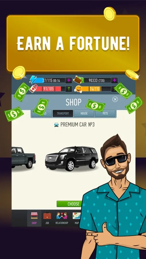 What career path will you pursue? You can become a successful politician, an ambitious startupper or perhaps you'd rather get into show business? Start from nothing and choose your own way to success and making money!