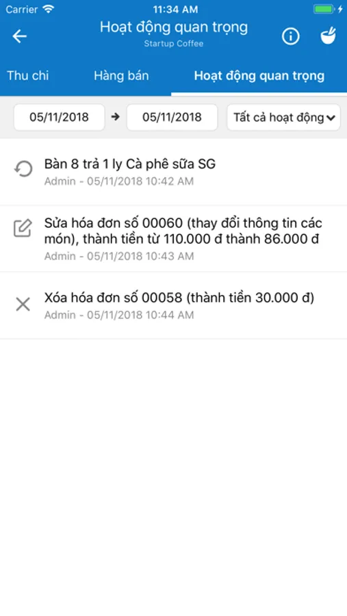 + Xem các hoạt động quan trọng (hủy món, sửa xóa hóa đơn, kết ca...)