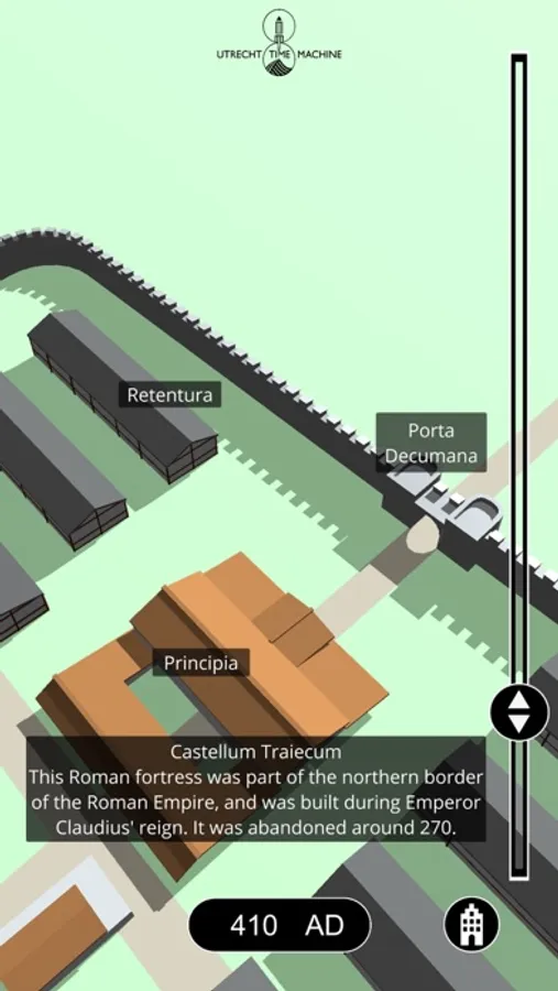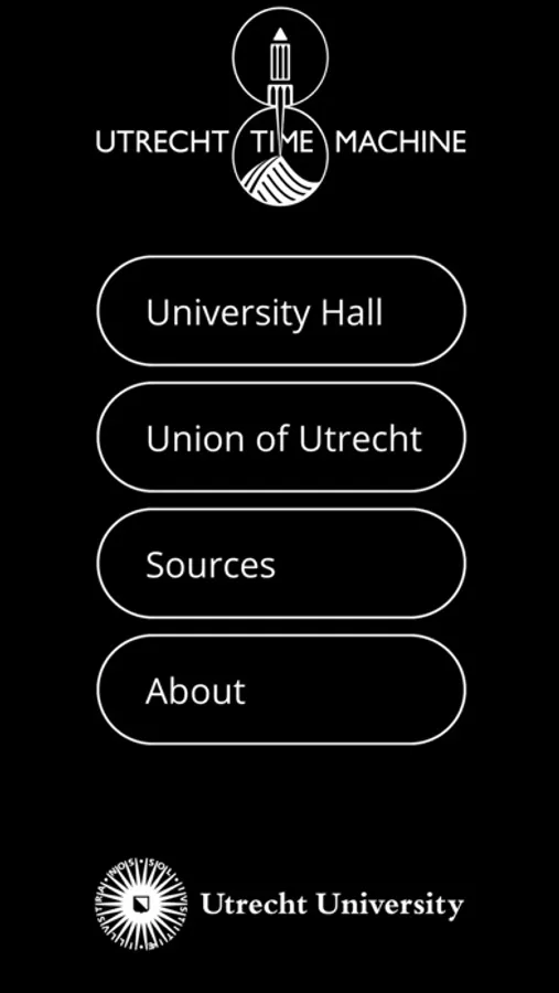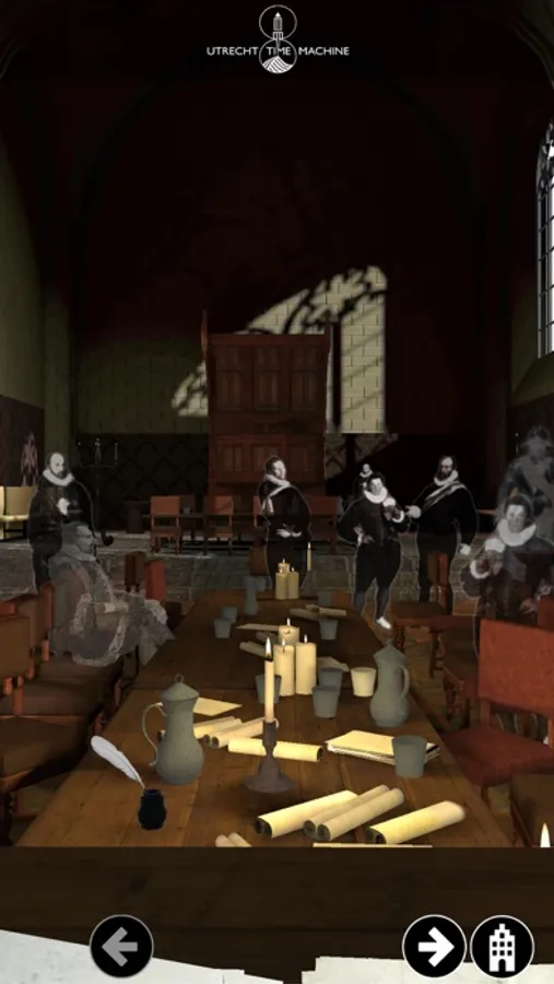 The UTM - University Hall app is the first prototype of the Utrecht Time Machine project. The app allows the user to travel back in time and visit the past. Besides looking into the development of the Domplein University Hall area the University Aula, former Chapter House can be visited. In this hall the Union of Utrecht document was signed on January 23rd 1579.