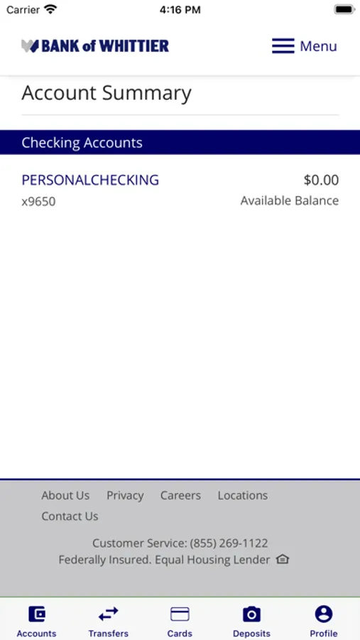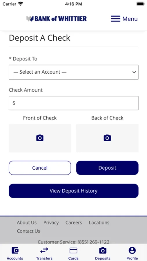 Questions? Please call 1-855-269-1122 or email mobile@bankofwhittier.com and we will happy to help you. Your mobile carrier’s message and data rates may apply.