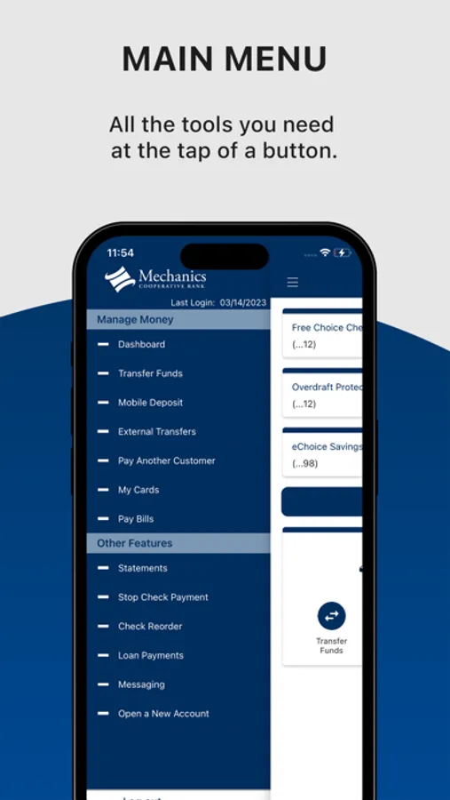 Mobile Banking from Mechanics Cooperative Bank makes everywhere and anywhere your virtual banking office. Get real-time account information, transfer funds and pay bills right from your mobile device with our simple and secure app. Mobile Deposit is also available for all Mobile Banking users and allows you to safely deposit checks as soon as you receive them. Why wait to go to the Bank? It’s as easy as “Tap. Snap. Deposit.” Learn how to better protect yourself against fraud by visiting www.mechanics-coop.com/security_center.com. Learn how we protect your privacy by visiting www.mechanics-coop.com/privacy_statement.com.
